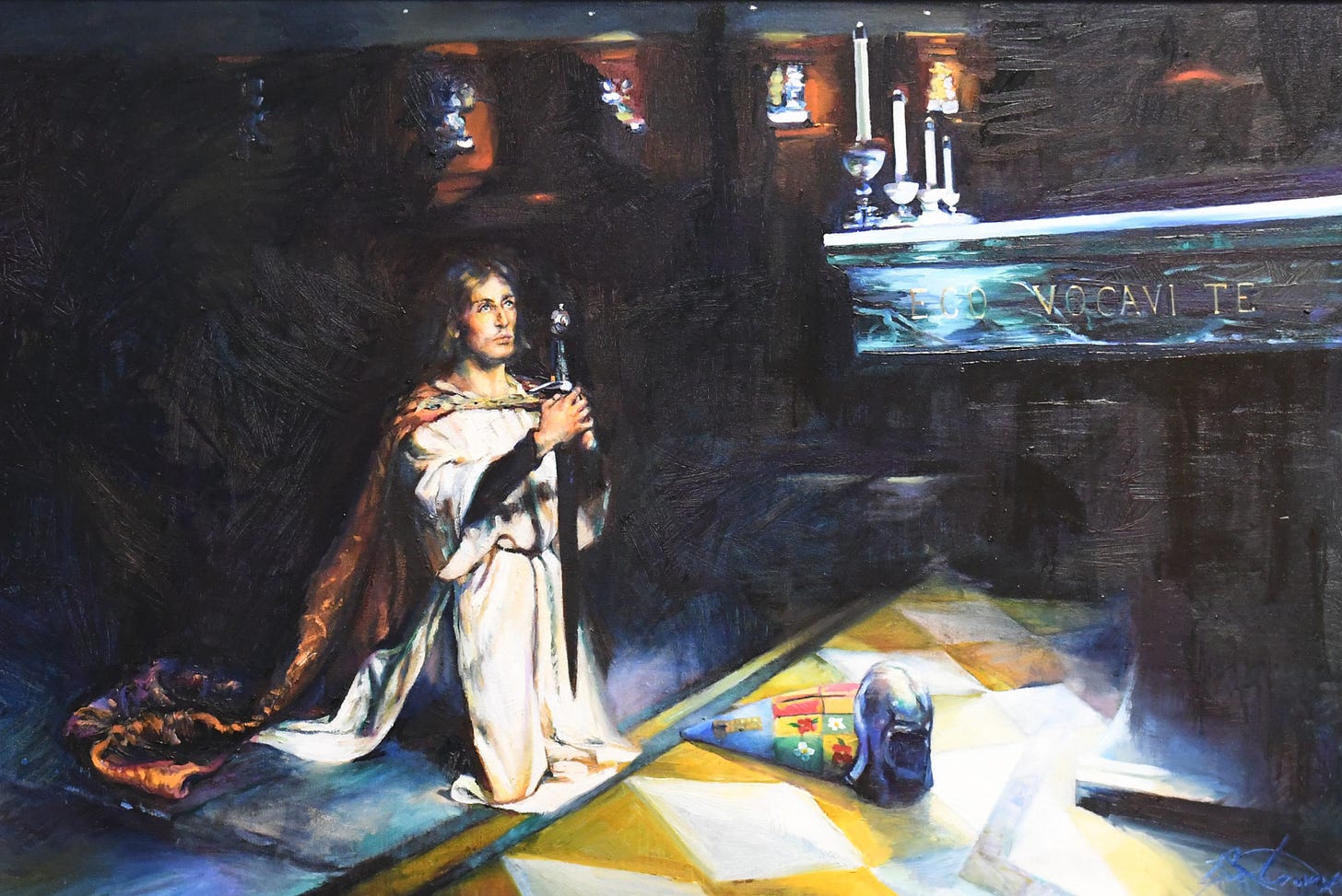 The second image comes from a painting in my office which is a rendition of John Pettie’s The Vigil. The painting shows a young man kneeling in prayer on the night before he is to become knighted, sword and shield by his side. I show this to my students to present to them the ideal of the protector. The knight, I tell them, has weapons—he is not safe—but he uses his weapons to defend what is good, true, and noble. He uses his strength to protect his family, his friends, his country, and ideals. His enemy is not other people but evil; and though sometimes he may need to neutralize threats, he is ultimately the friend of all, desiring that even his enemies should find the true path.